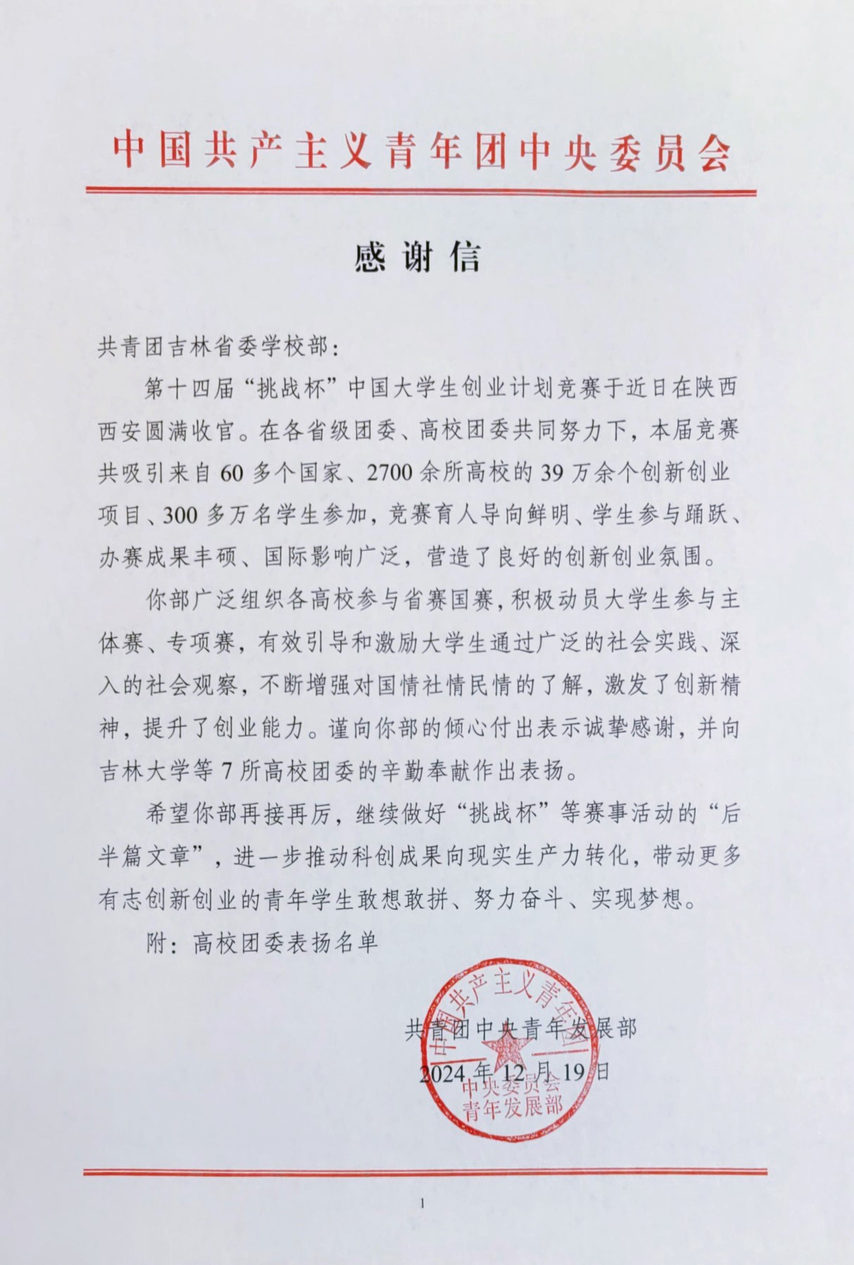 近日,共青团中央青年发展部对在第十四届“挑战杯”中国大学生创业计划竞赛组织工作中表现突出的省份团委和高校团委致信表扬。我校因在竞赛组织发动工作中表现突出,成绩优异,被团中央点名表扬。